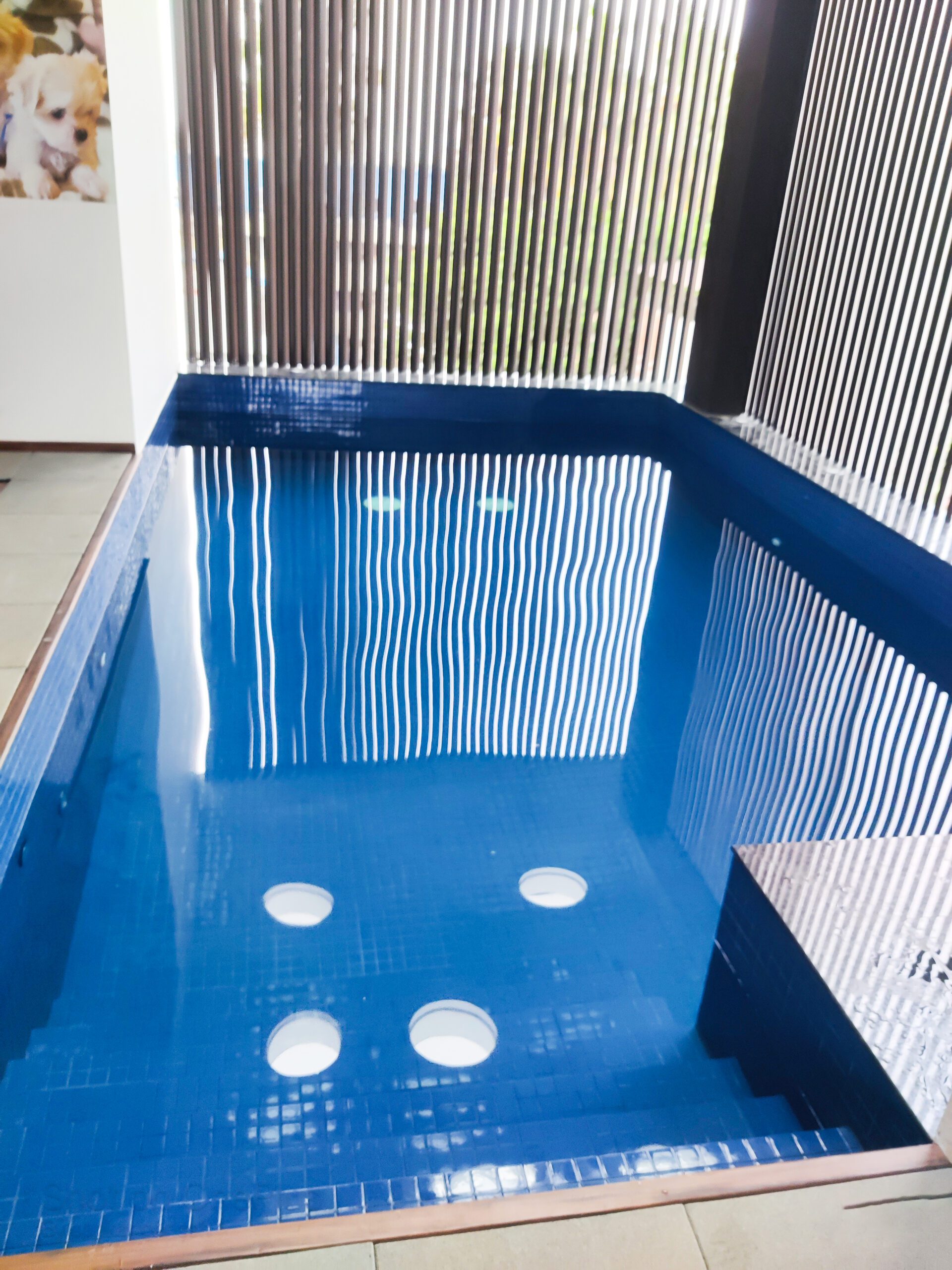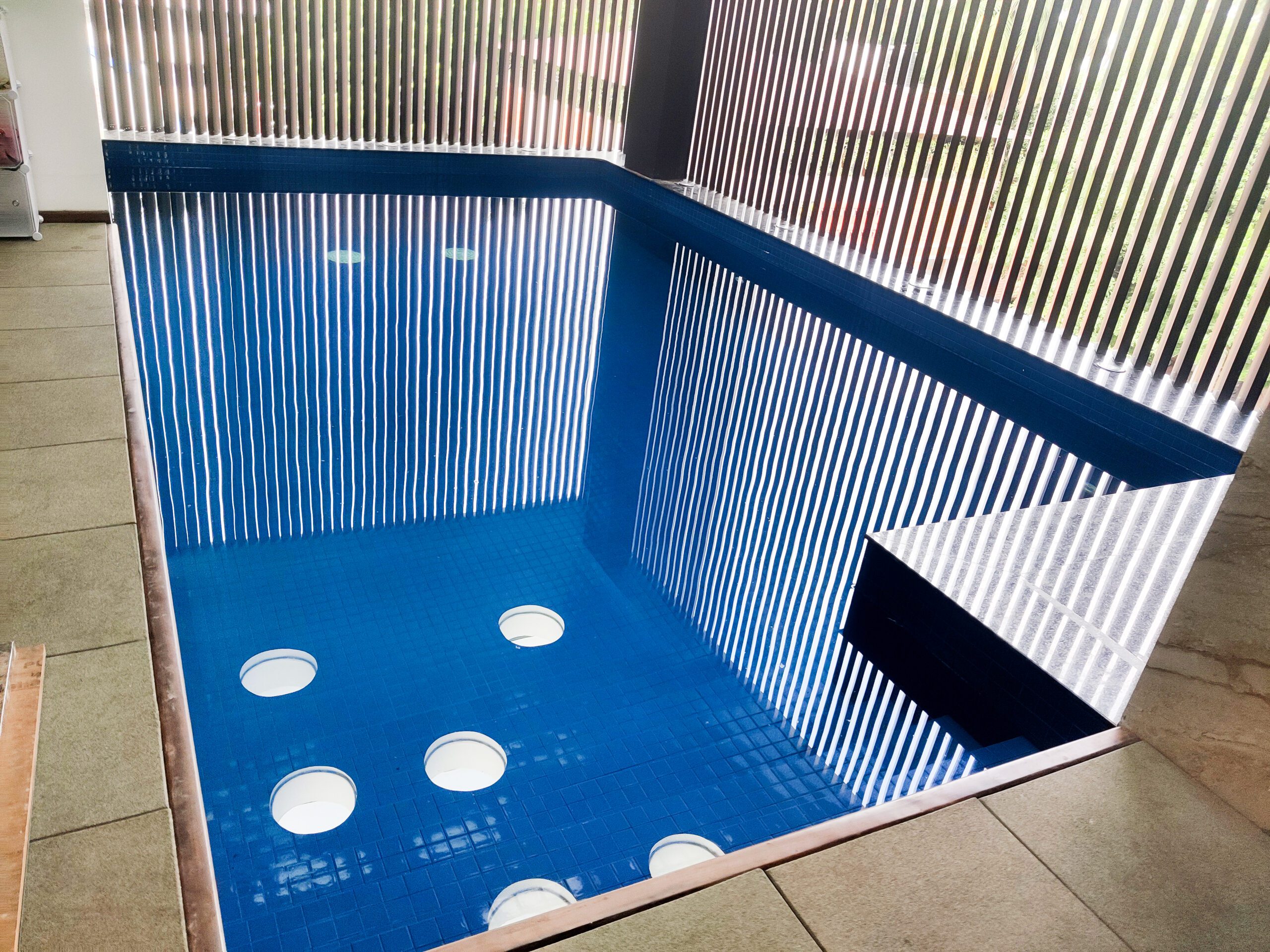 Size of the pool is 20×12. It’s a terrace pool. It has a coloured light with porcelain tiles. Coping done by polished granite