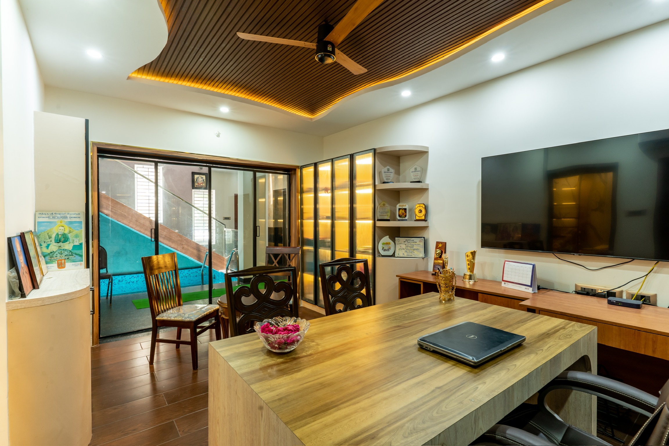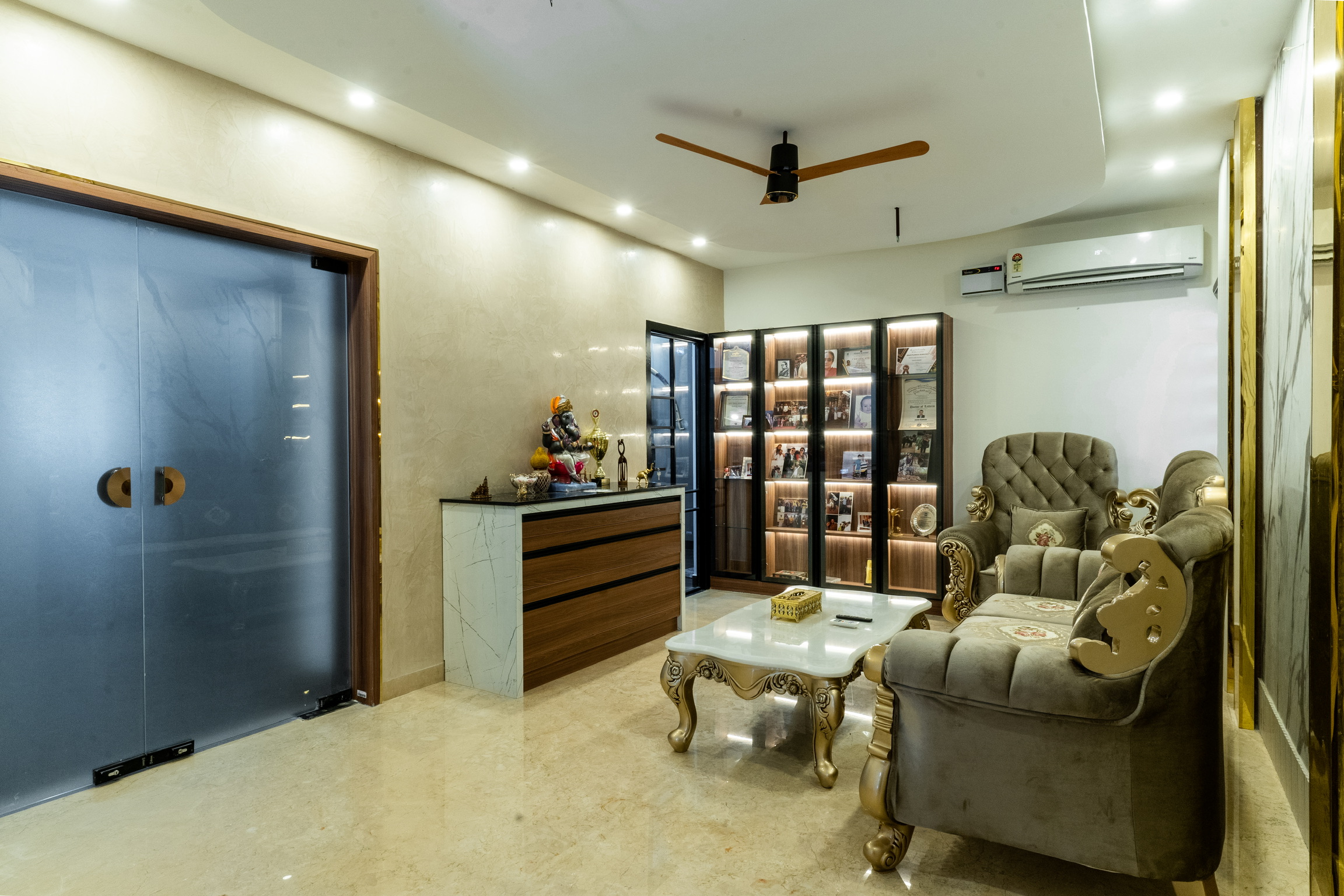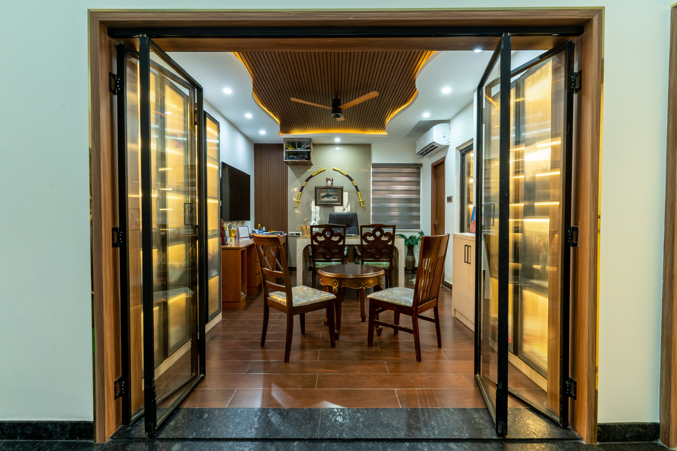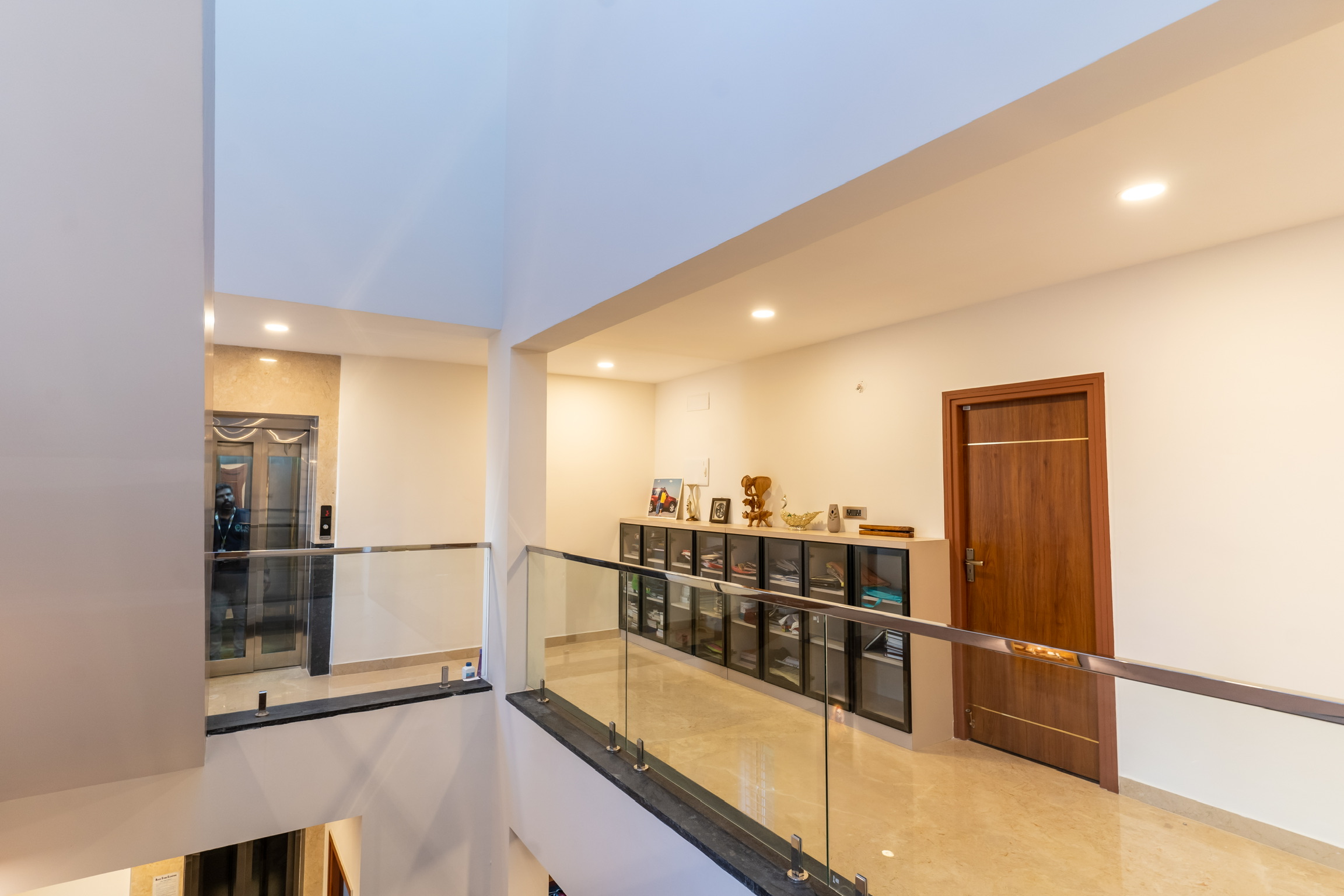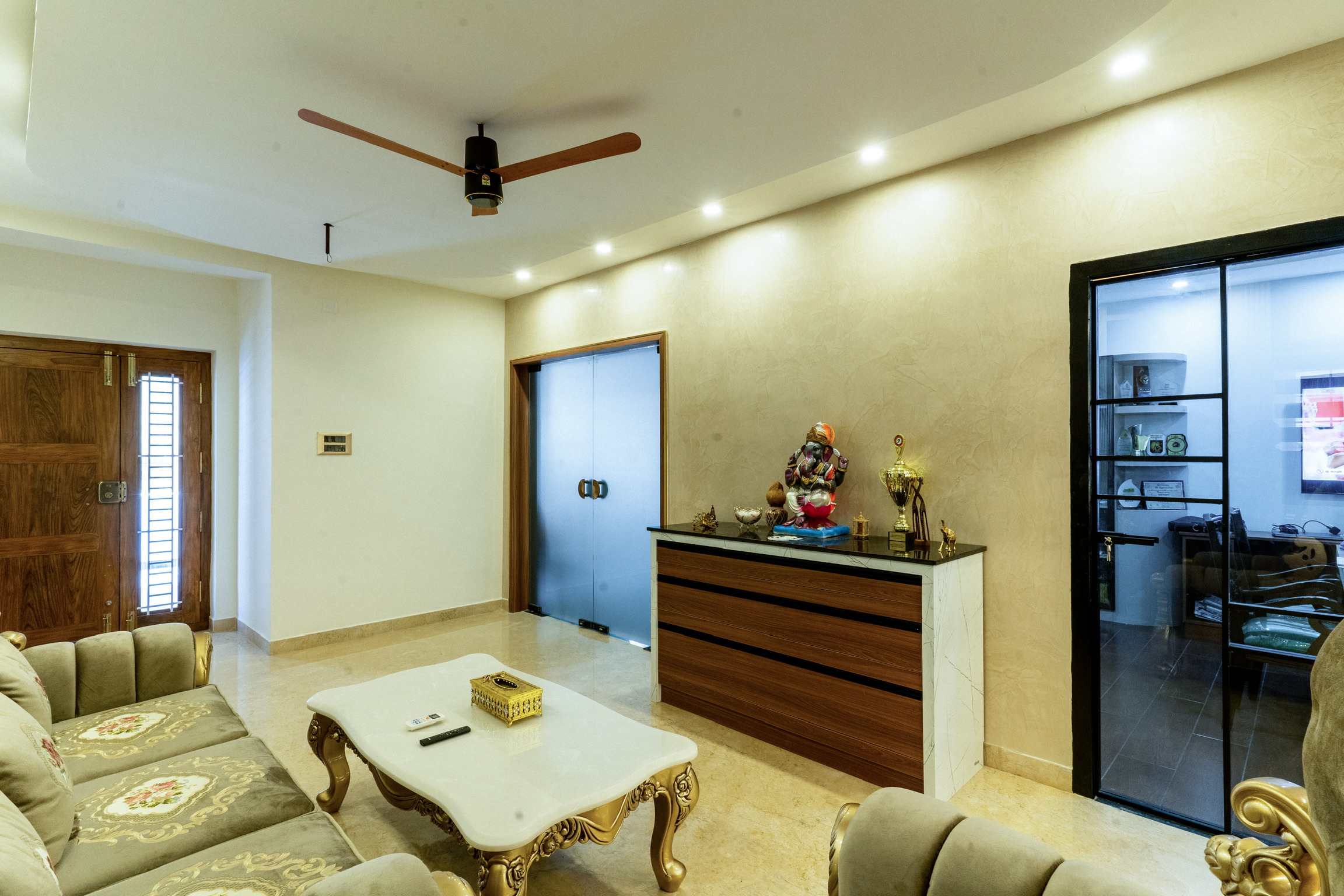 The ground floor, spread at the rear end of the plot has an office space with a meeting space, a pantry and the maid’s quarters.
