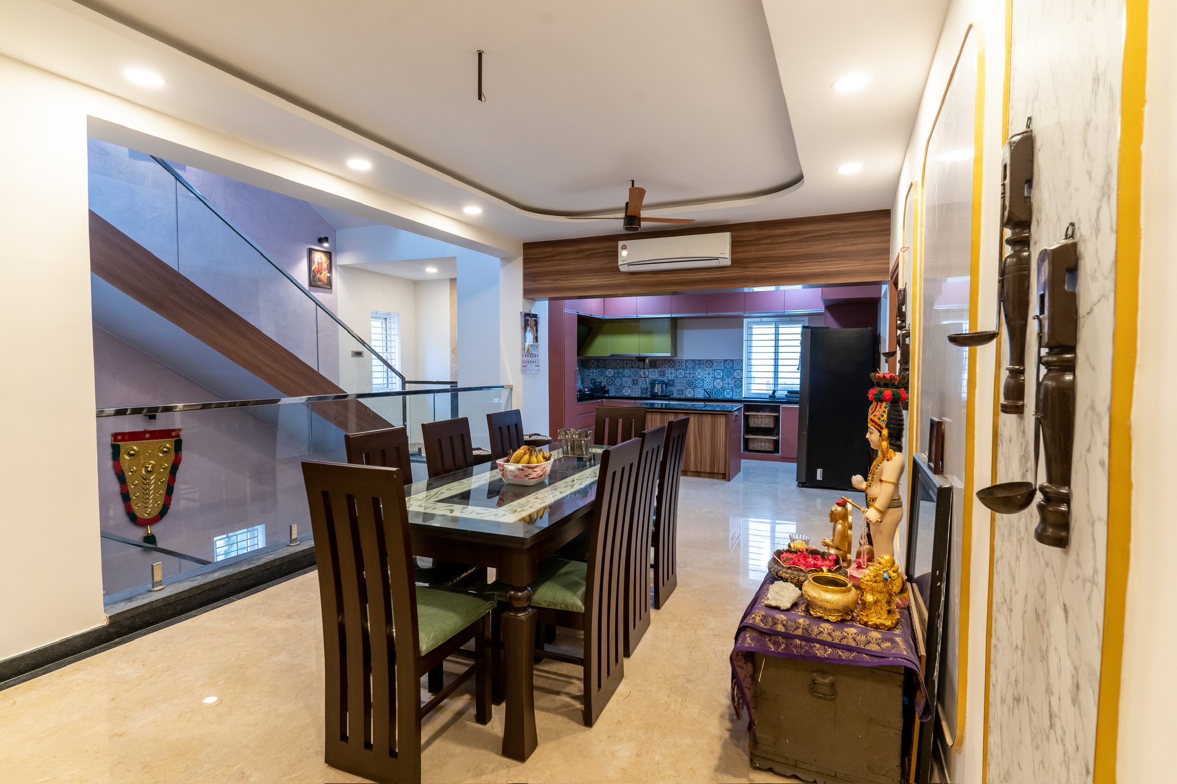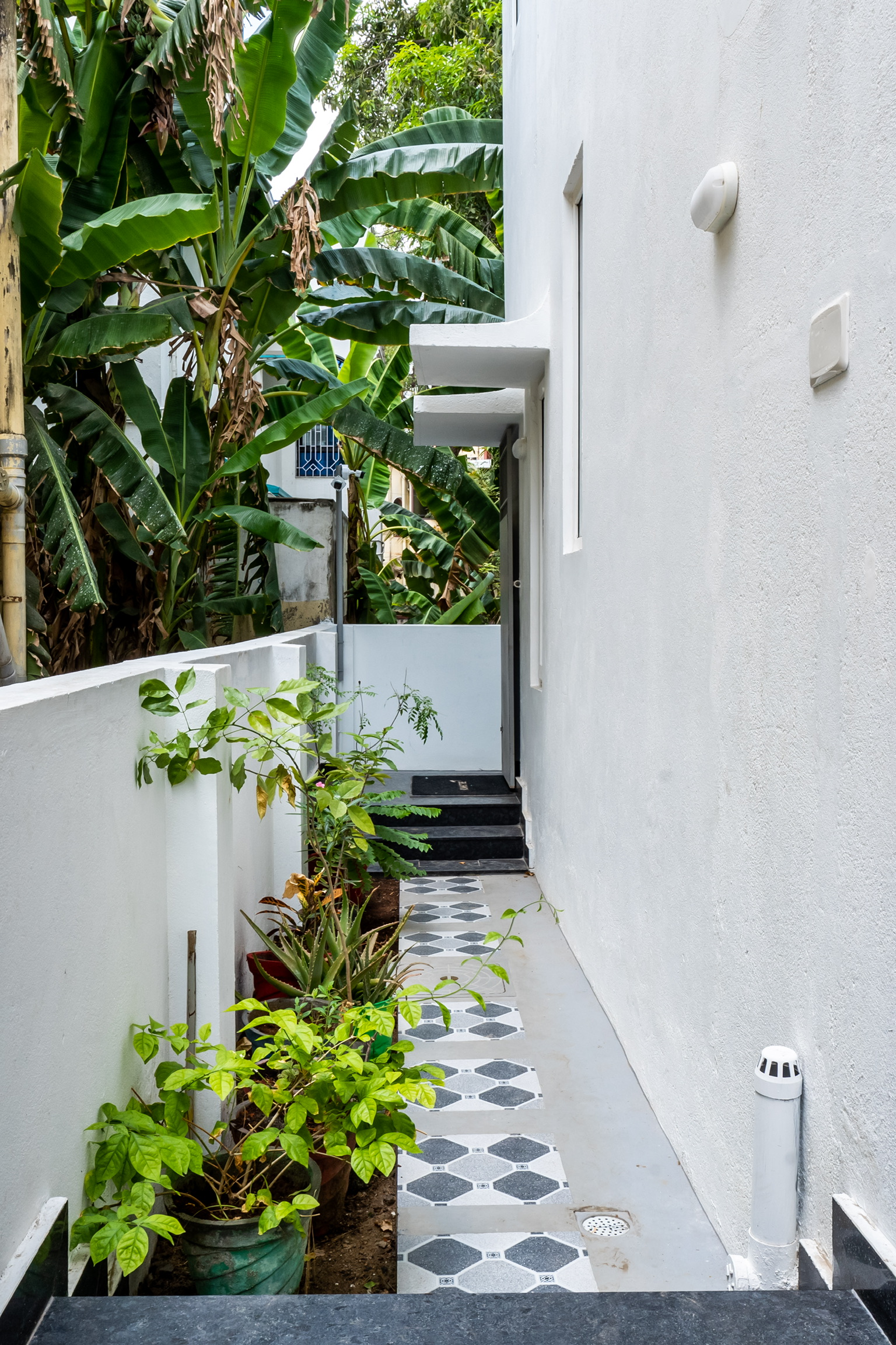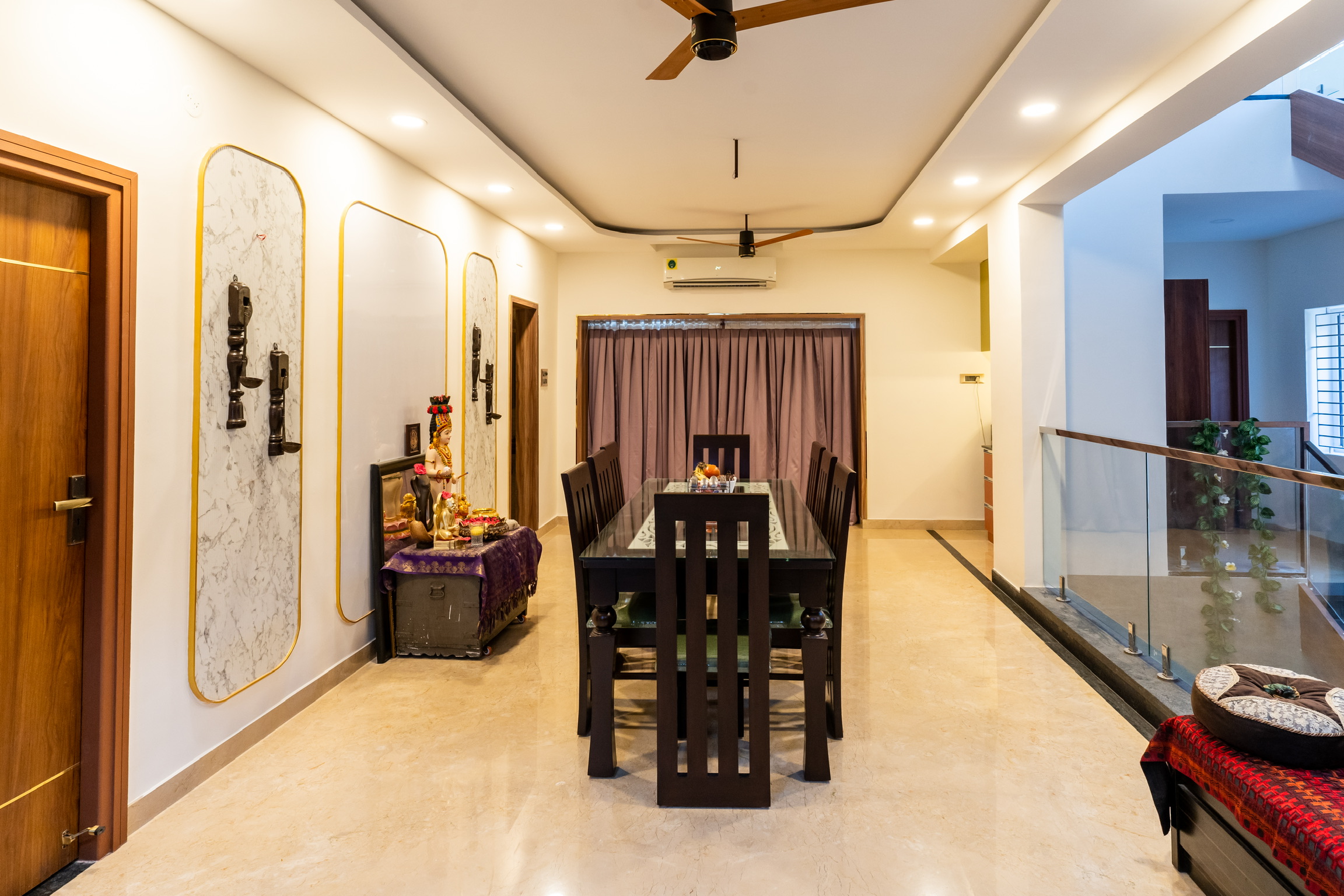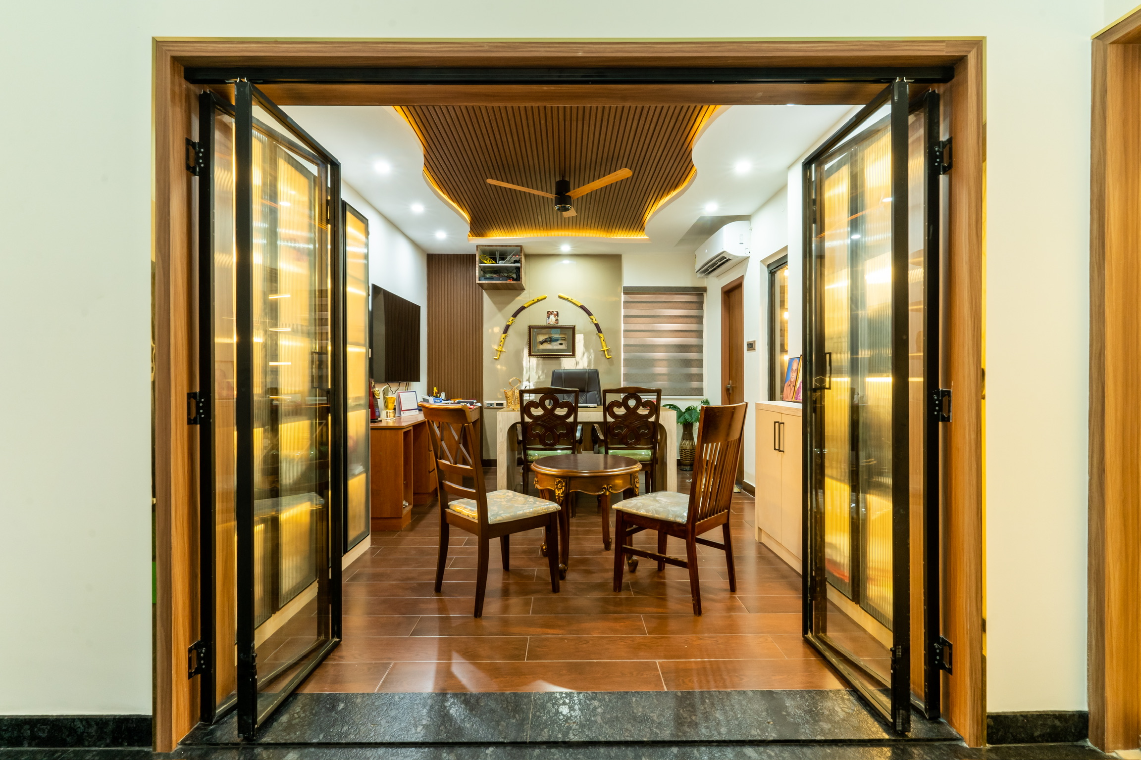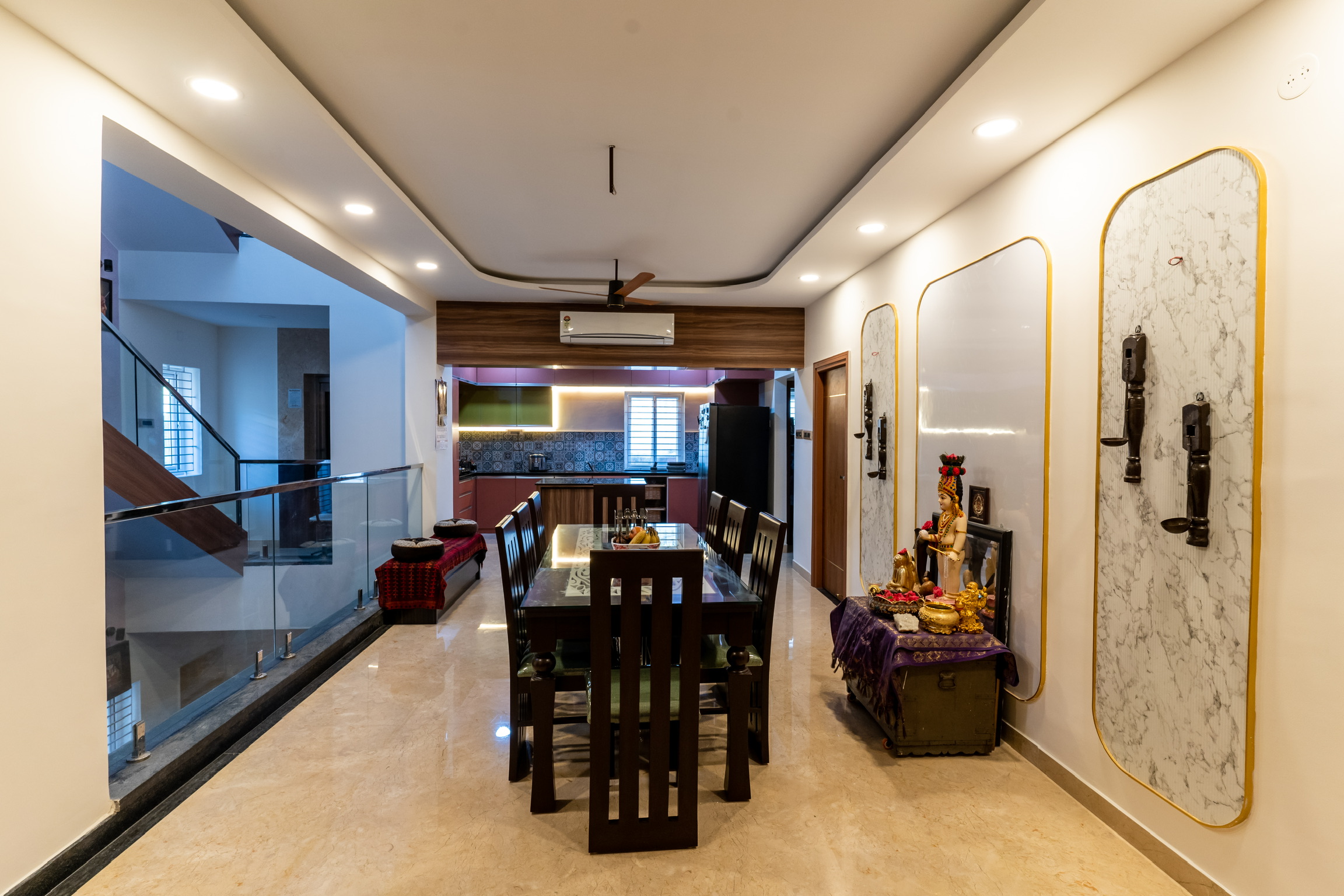 The ground floor, spread at the rear end of the plot has an office space with a meeting space, a pantry and the maid’s quarters.