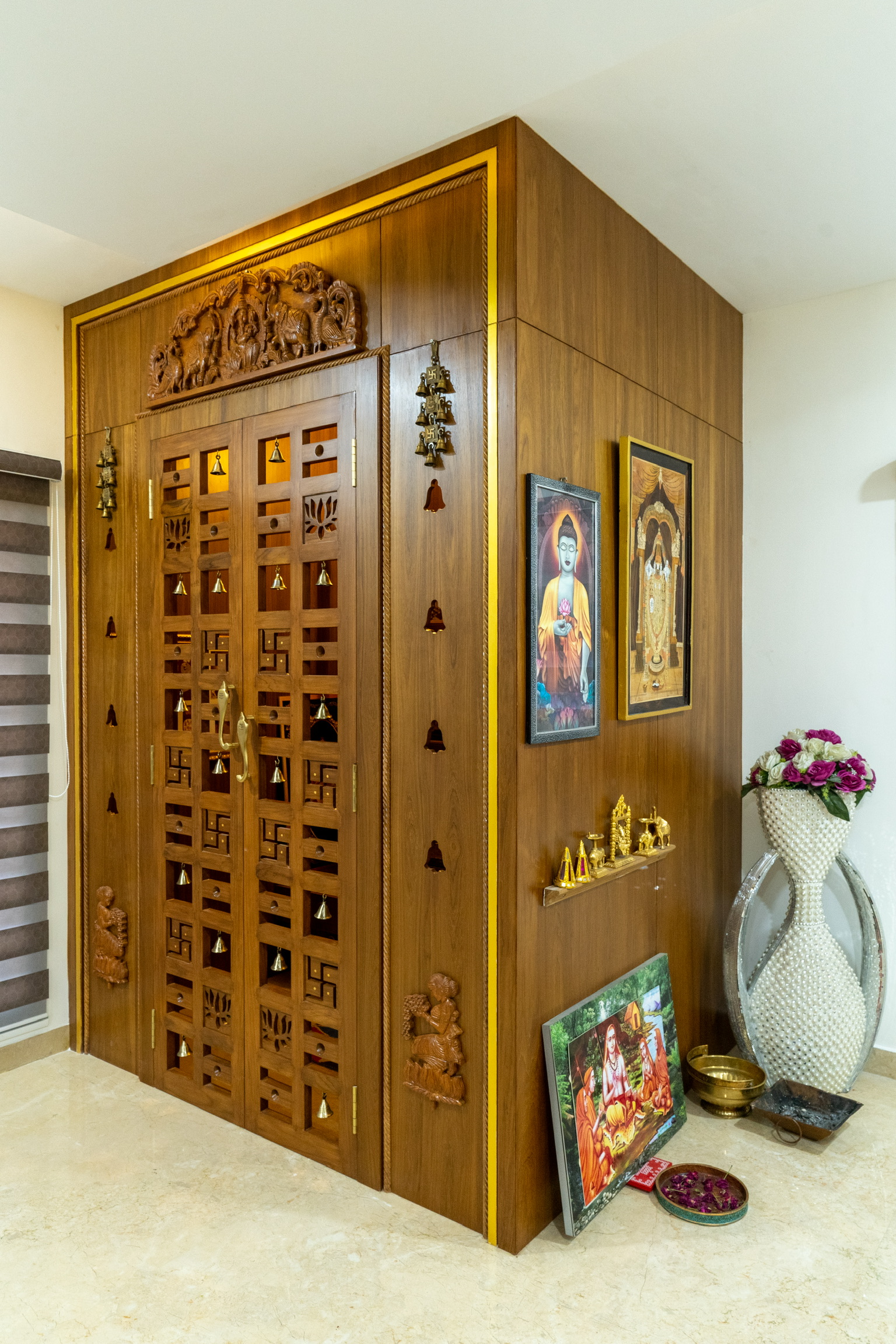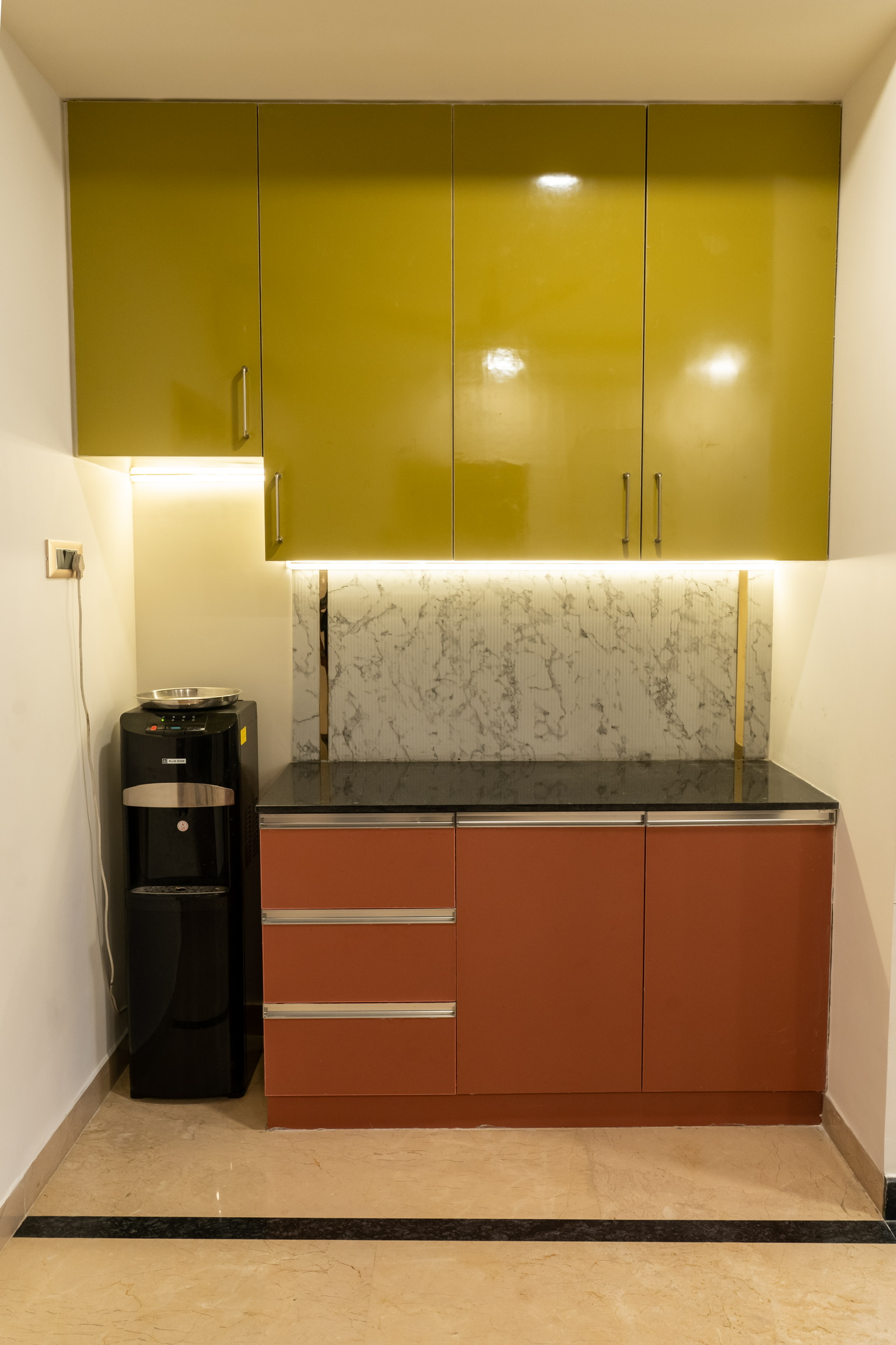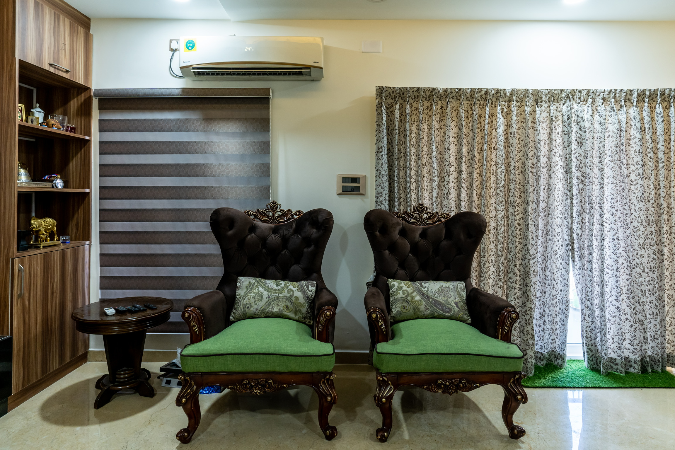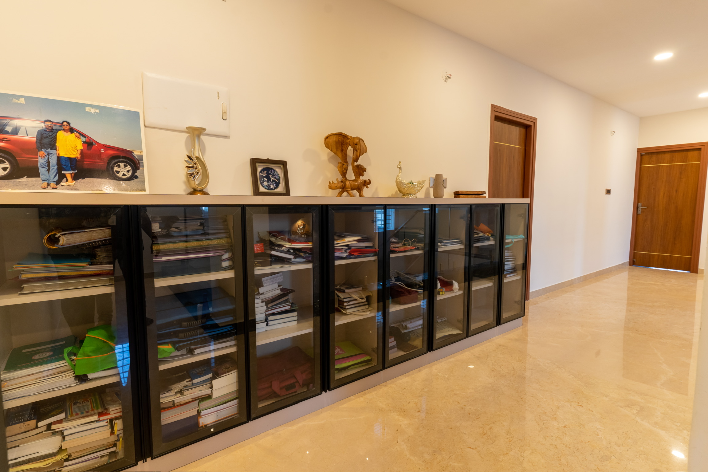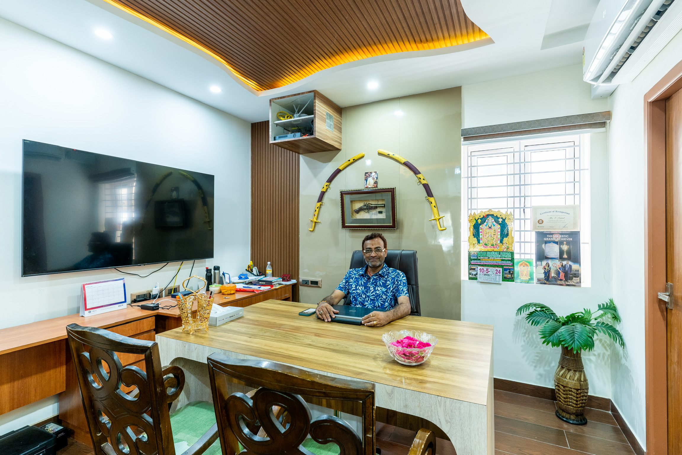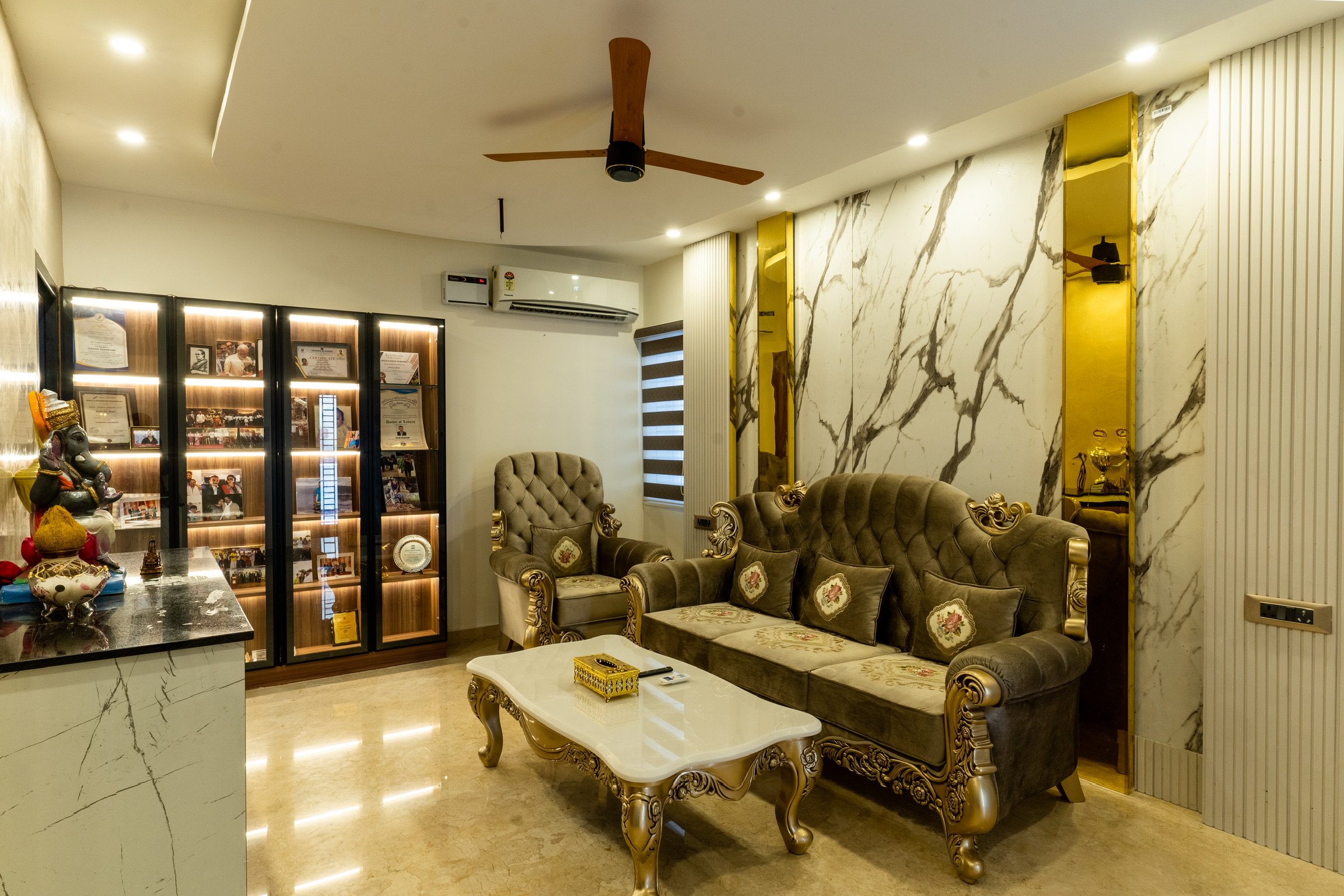 The ground floor, spread at the rear end of the plot has an office space with a meeting space, a pantry and the maid’s quarters.