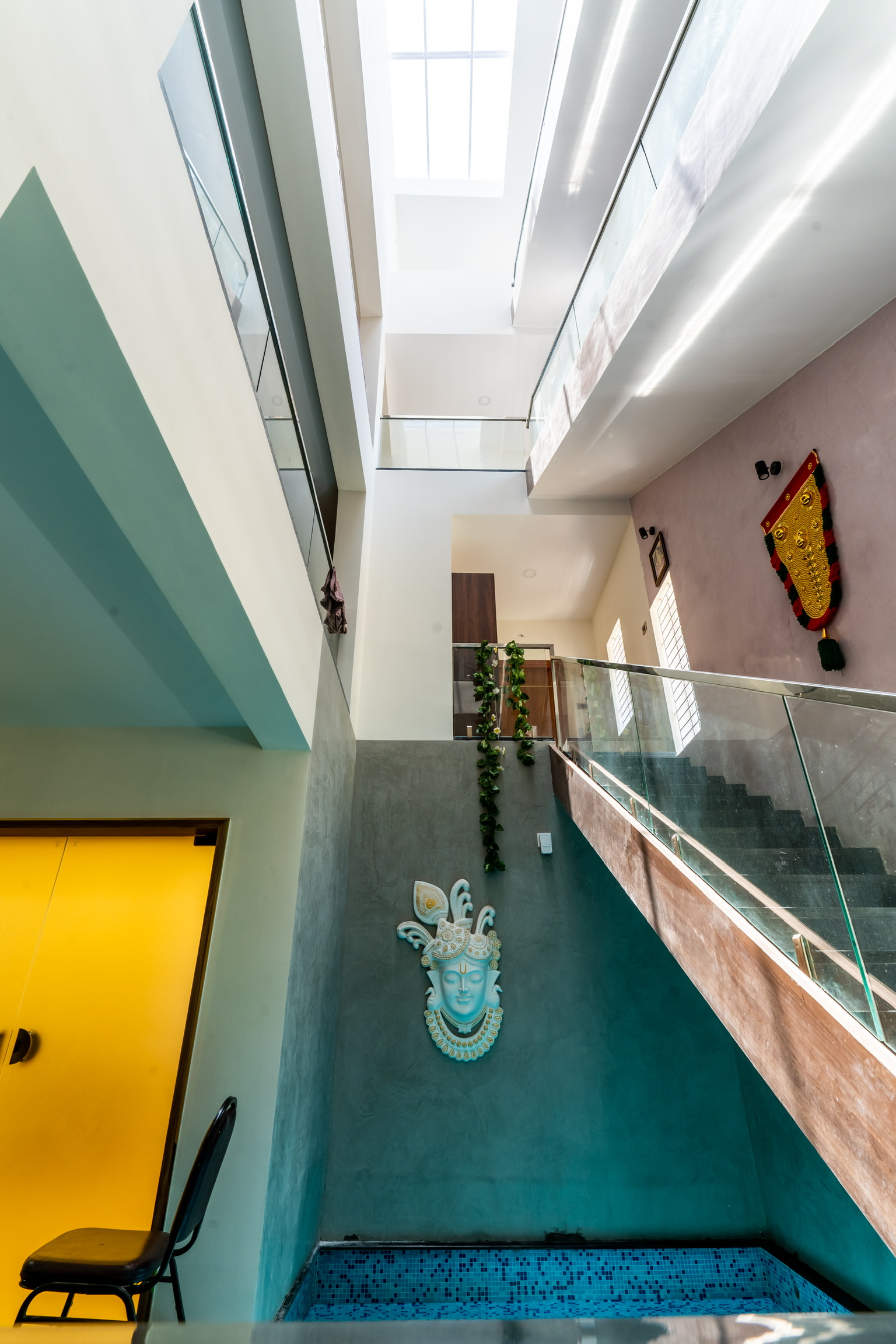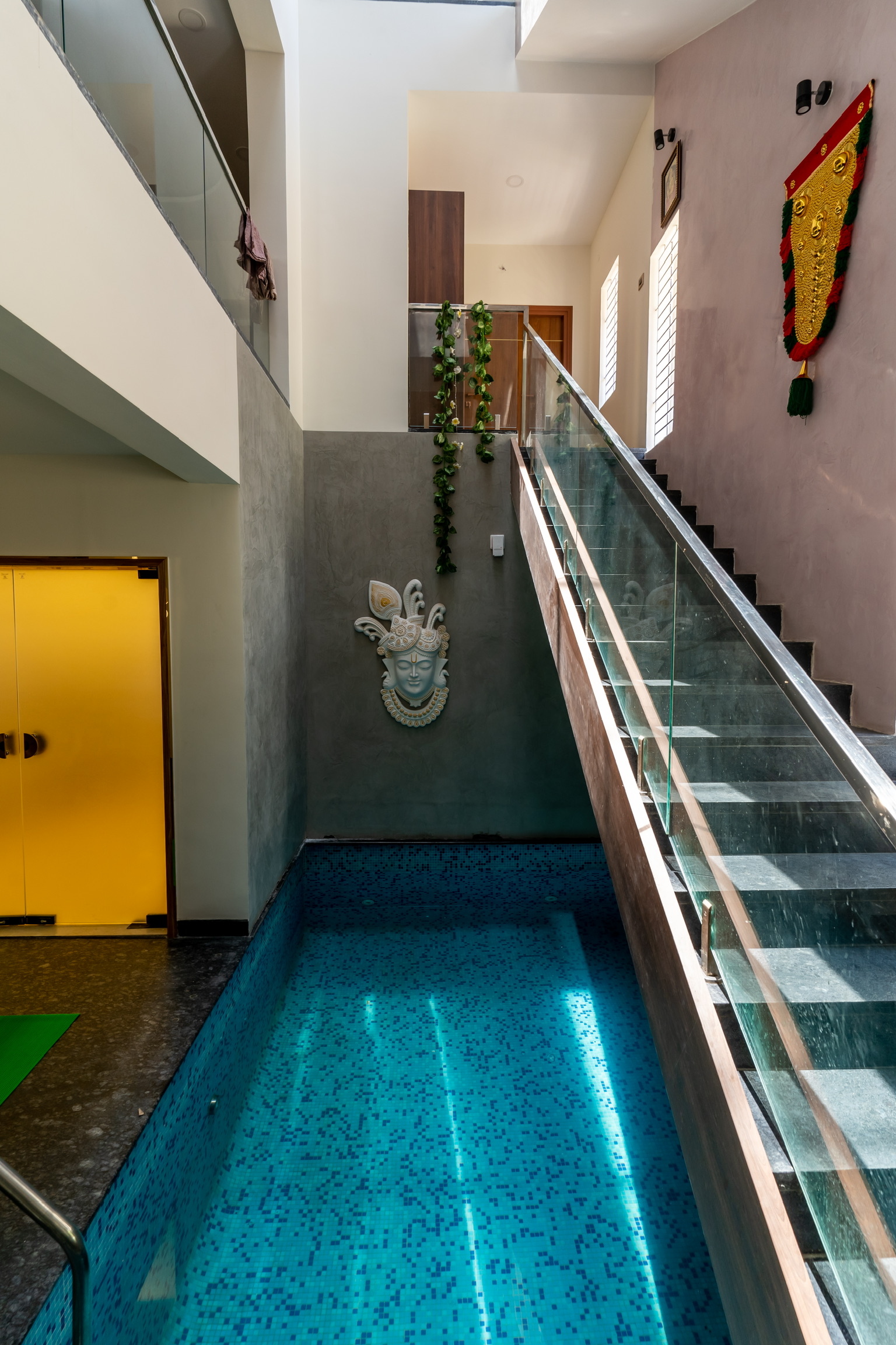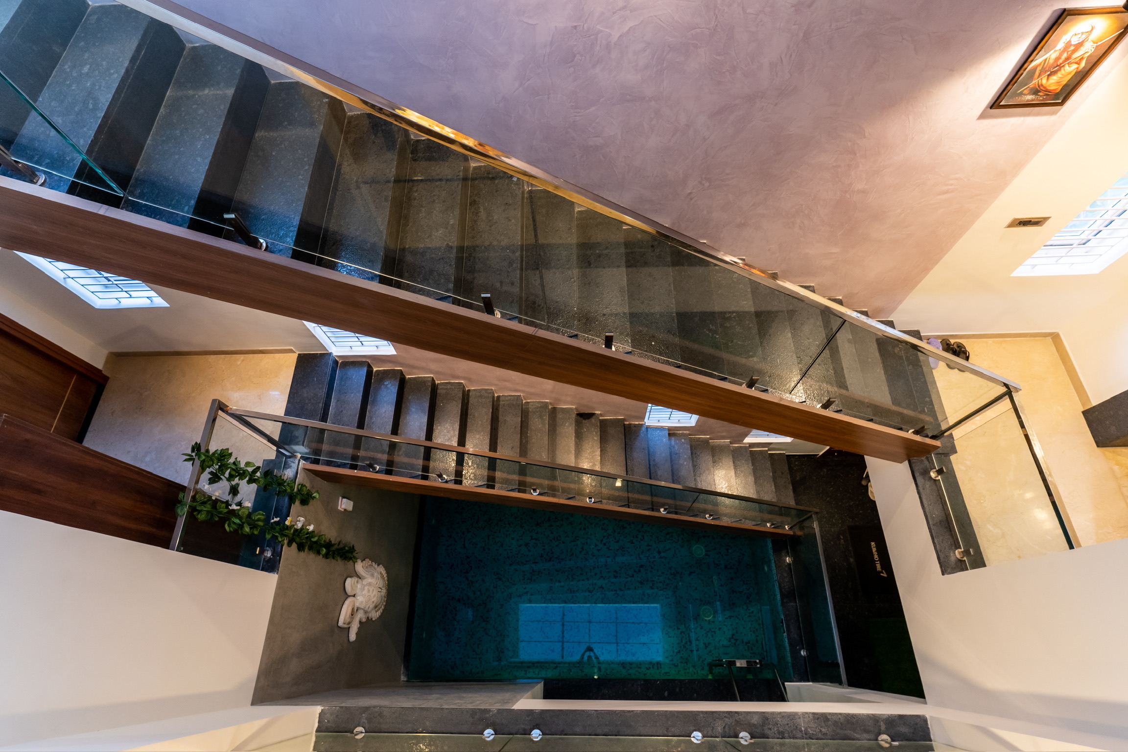 A swimming pool is provided beneath the staircase flight along with a shower on the opposite side. An elevator that can be accessed from the outside connects to the upper level directly to the kitchen area.
