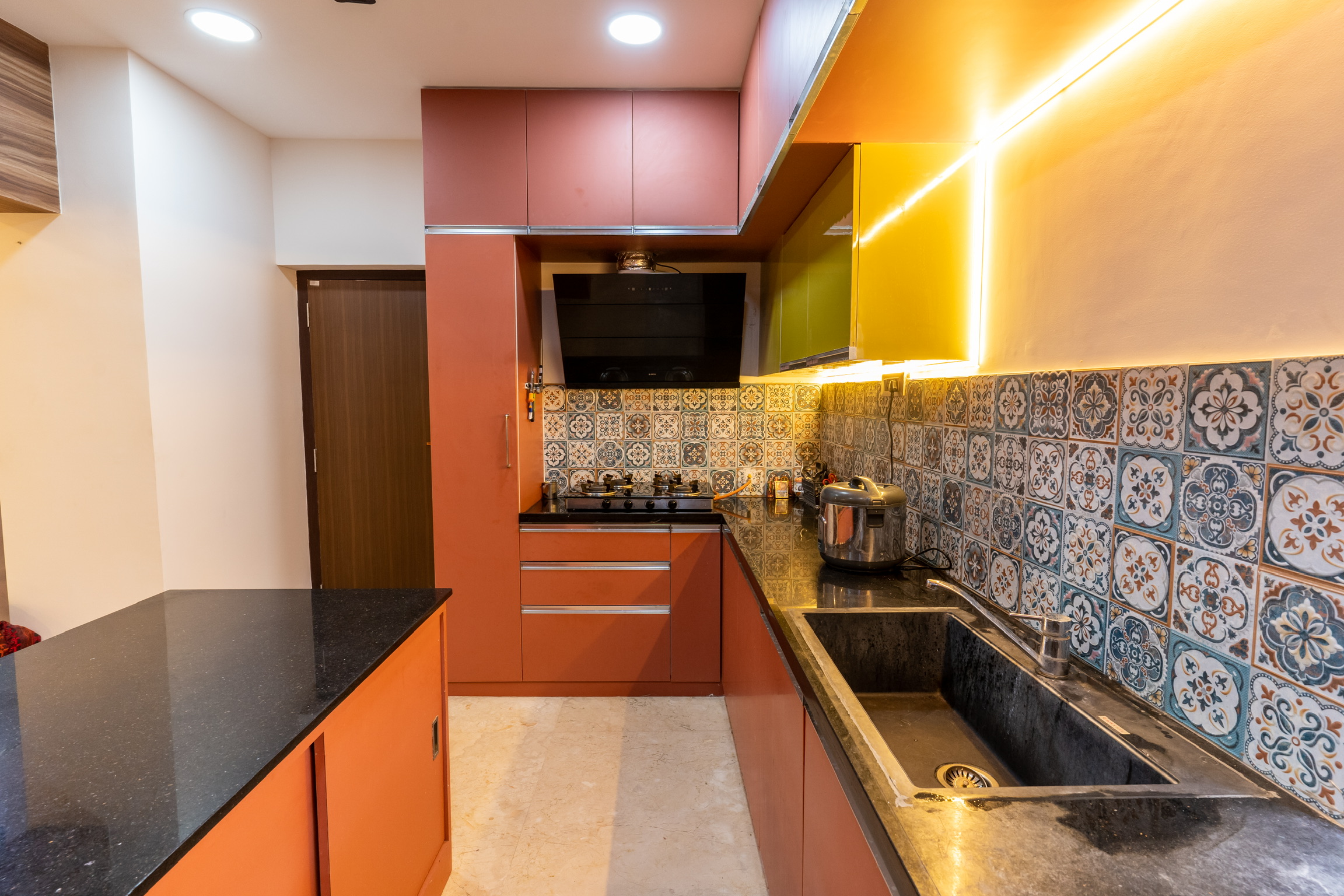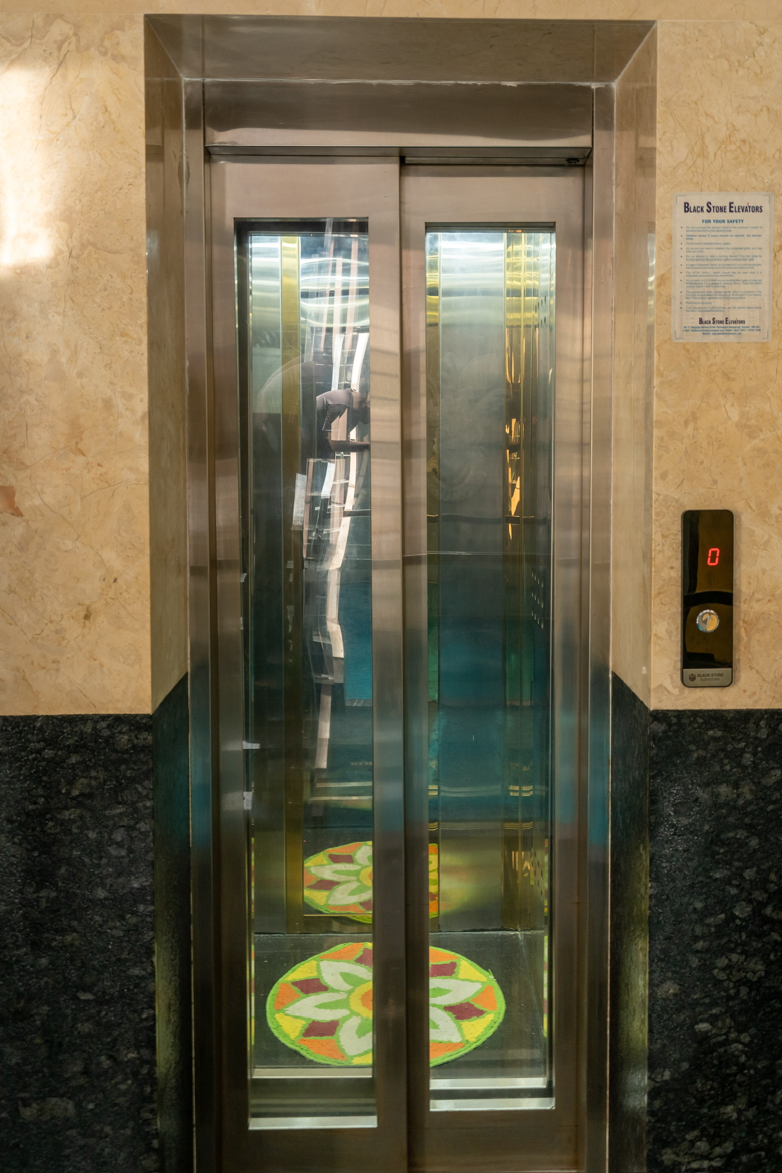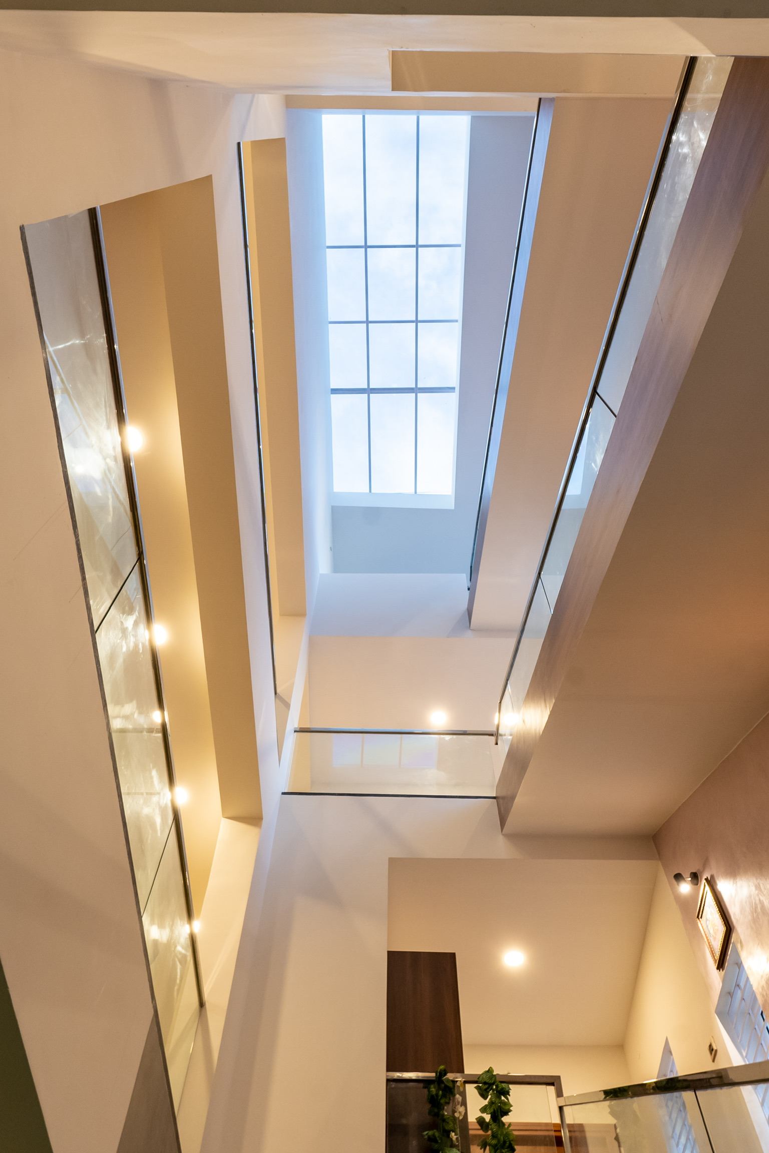 A swimming pool is provided beneath the staircase flight along with a shower on the opposite side. An elevator that can be accessed from the outside connects to the upper level directly to the kitchen area.