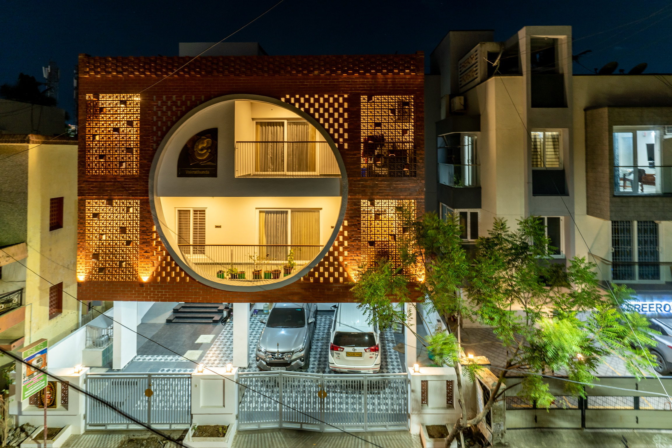 The building has a fusion of modern and traditional facade made of concrete and terracotta jaalis prominent with a large circular fenestration.