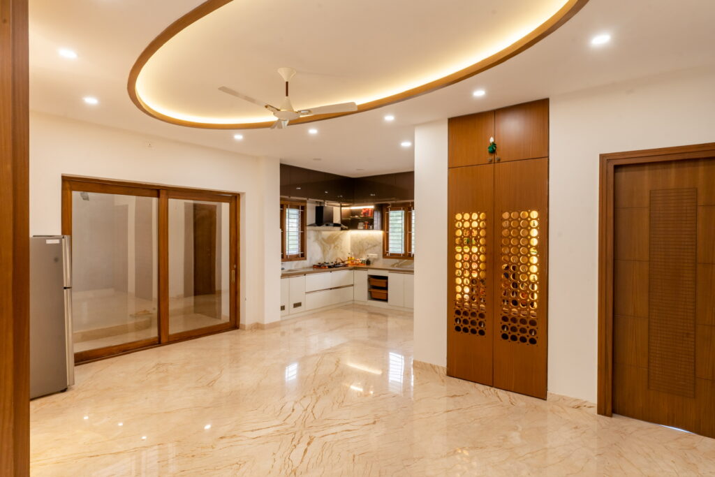 • Teak Wood Craftsmanship: Evident in the Karaikudi-style door, this woodwork adds a touch of tradition and durability.